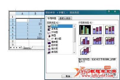 1、选择Word表格的数据区。 2、单击视图菜单,插入,图片,图表。 3、插入好了数据图表以后,你就可以在图表类型中选择,柱形图表,然后挑选一个自己需要的图表样式就可以了。 |