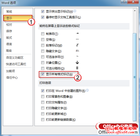 在窗口左边按“显示”,勾选“显示所有格式标记”。