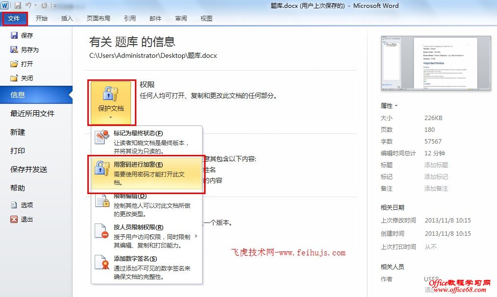 在公司中我们会议很多机密的文档,这时我们就需要用到加密功能,今天小编为大家介绍一下如何使用word2010加密文档。 首先在“文件”菜单中选择“保护文档”中的“用密码进行加密”项,如下图所示。
