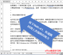 一篇有很多页的长文档,如果在某页中编辑之后,又跳到另一页编辑,之后忽然想起前面的编辑还有问题,如何快速跳转到前面的编辑点呢?滚动吗?或许你哗哗哗转半天滚轮,还是没找到那个地方。现在,只需按下Shift+F5,就可以快速跳回到上次编辑的地方了。这就叫神速!...