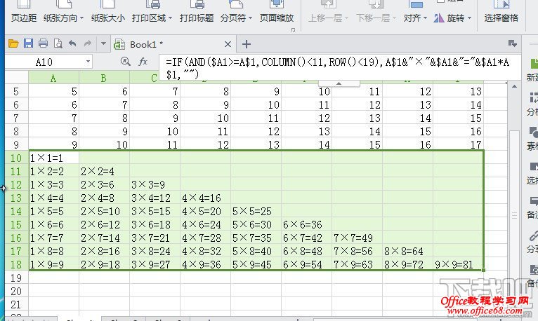 5:重复第三部,将A10到I18,全部拉扯出来,这样一个九九乘法表就展现在我们眼前了。