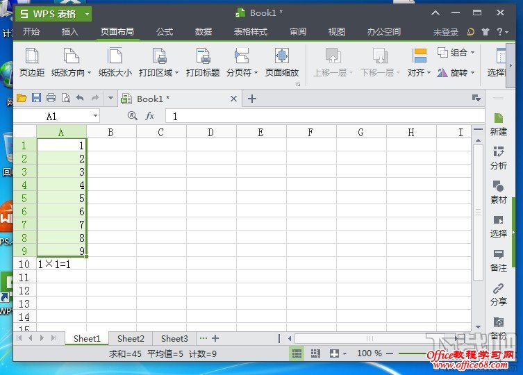2:选择A1栏,当鼠标变成黑色十字后,点击拉扯鼠标到A9,这样1-9的数字就出来了。效果如图。
