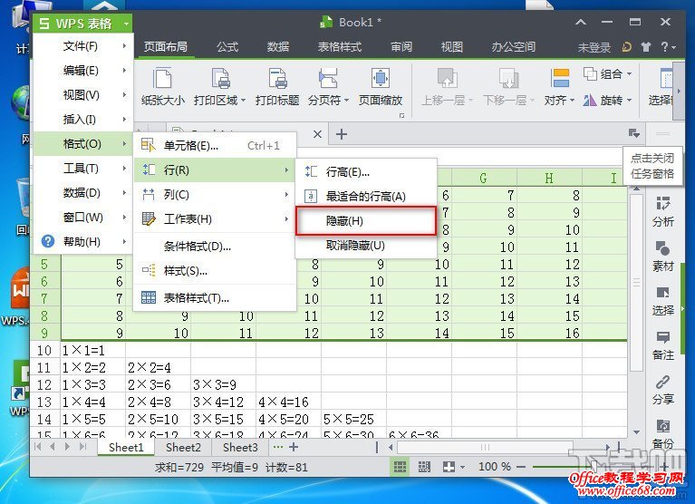6:这个时候页面并不美观,我们还要事情要做,选择1到9行,点击格式---行--隐藏。