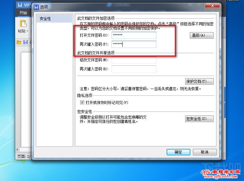 2:在文件加密页面,选择:“此文档的文件加密”输入密码。输入完成后点击确定。这是整个文件进行加密,下面的“此文档的文件共享选项”,是对文件中的内容加密。