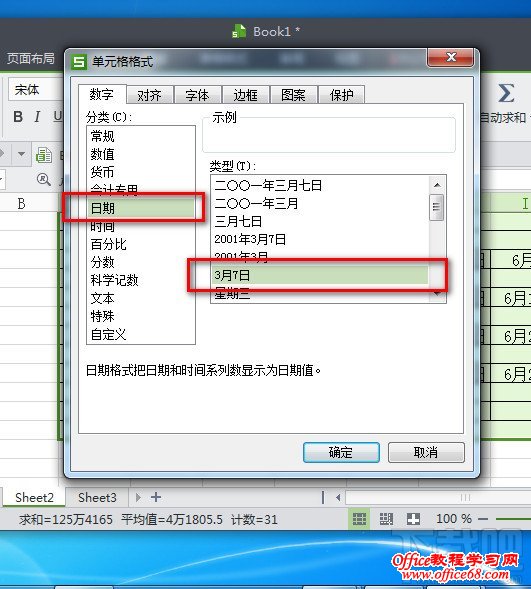 3:进入单元格设置页面后,点击数字,选择日期。格式为3月7日。