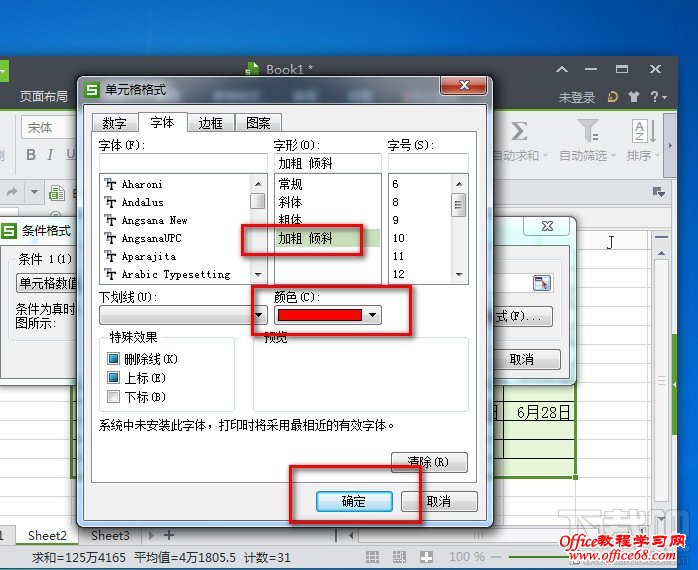 6:进入格式设置页面后,点击字体,设置字体颜色为红色。字体为加粗倾斜。完成后点击确定。返回条件格式再次点击确定。