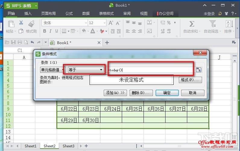 5:进入条件格式后,选择单元格数值 等于 =today(),效果如图所示,记住这个一定要按照图上的填写。输入完成后点击格式,进入格式设置页面。
