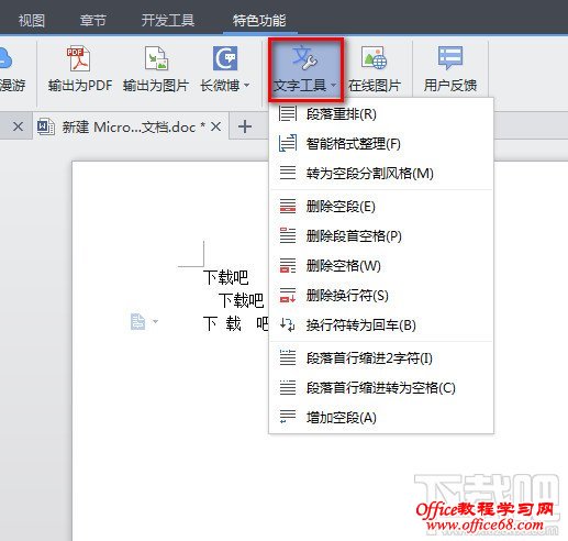 3:你想要段落重排吗?想要删除空段吗?想要段落首行缩进2字符吗?就点击“开始”--“文字工具”或者在“特色工具”找到“文字工具”