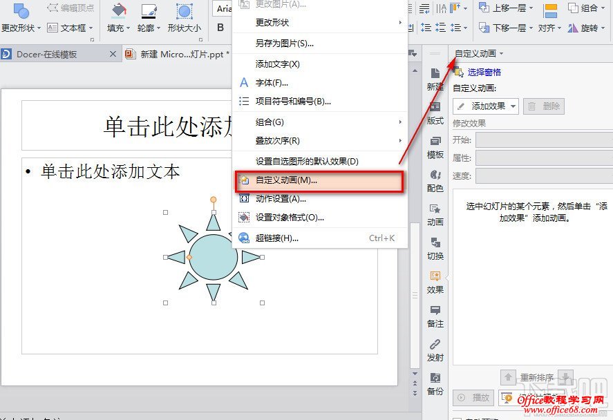 2:在画好的图右击,选择“自定义动画”。