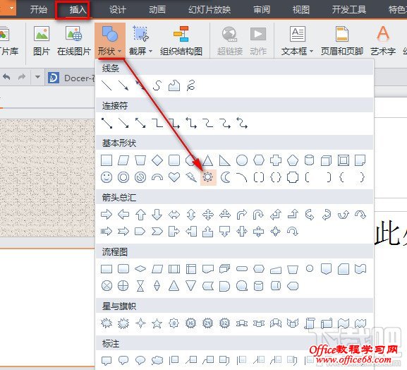 WPS之PPT设置旋转动画。一个好的ppt可以做成动画一样,可以灵活在活动。比如设置一个画面旋转,变成一个动画。让你的ppt内容更加丰富。不用很多技术,几步骤就行的。现在小编跟大家演示一下怎么让一个静止画面旋转成动画。 WPS之PPT设置旋转动画:1:点击“插入”--“形状”这里选择一个等会旋转起来比较明显的图案。