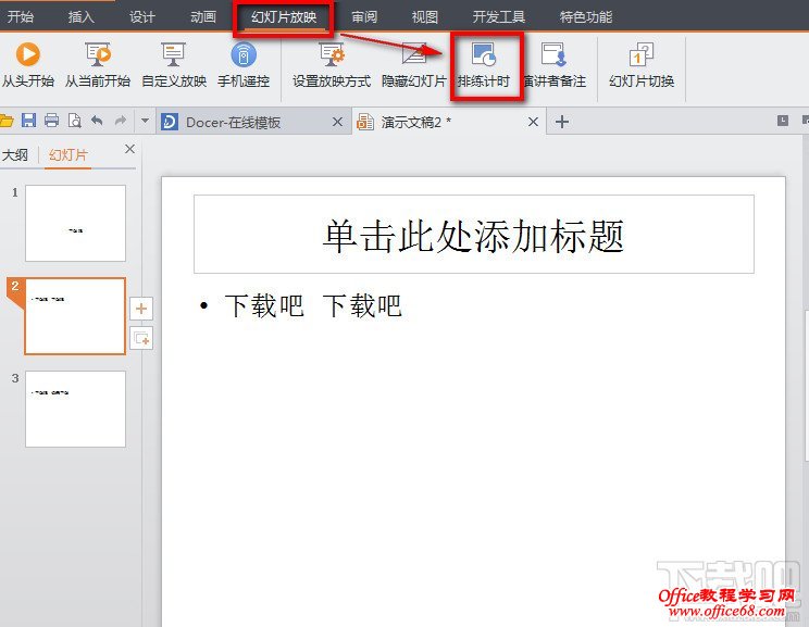 设置“排练计时”,在菜单栏“幻灯片放映”中的“设置”选项组中可以找到,点击“排练计时”按钮即可,如下图: