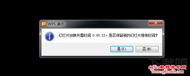 3:排练完成后(也就是PPT放映完成后),会弹出一个提示框,提示是否要保留新的幻灯片排练时间,点击“是”按钮即可(如下图:),此时,播放幻灯片就会是按预先排练的进行自动切换的播放,而不再需要手动操作来切换了。