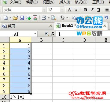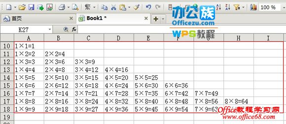 自己利用WPS表格绘制小学数学常用的九九乘法表