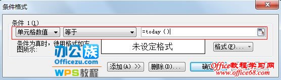 2 将条件设置为单元格数值等于=today(),然后点击格式按钮。