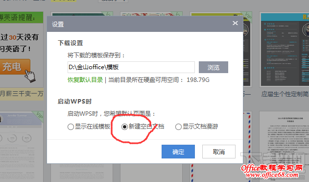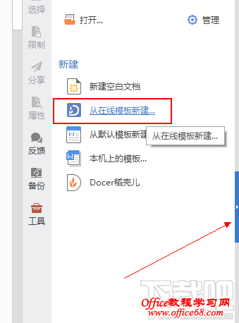 然后重启一下wps,你就会发现烦人的稻壳儿模板页面就没了,当然你想在稻壳儿找模板,还是可以通过下图所示打开 找到最右侧点击蓝色条框。