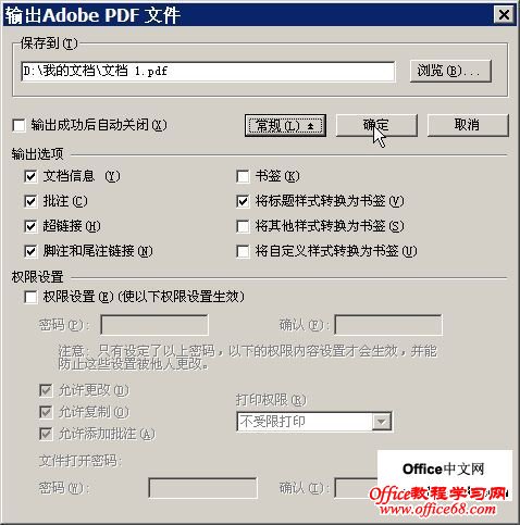 PDF是一种通用的文档标准,它可以跨平台浏览编辑,非常方便。 WPS 2010 支持将文档导出为PDF文件,先保存好文档,再选择“文件”→“输出为PDF格式”,然后作相应设置(如图1,可加密)即可将其导出为标准的PDF文件。