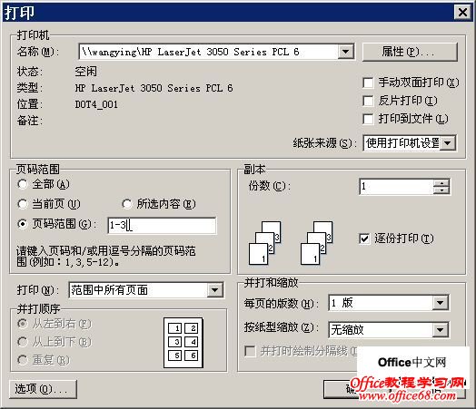 (4)只打印指定页:在“打印”窗口的“页面范围”下进行设置,可选择选择“当前页”项,打印当前光标所在页的内容;选择“页码范围”项,输入指定的页码或页码范围,如“1-3”可以打印出第1页至第3页的全部内容(如图6)。如果要打印第1页和第3页,则只要输入1,3即可。