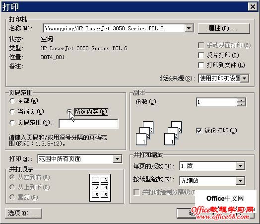 (3)只打印指定部分文档:在文档中选定需要打印的部分内容,然后在“打印”窗口中选择“页面范围”下的“所选内容”即可(如图5)。