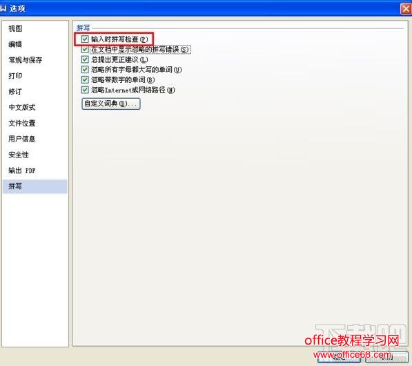 2、弹出选项对话框,选择拼写,选中输入输入时拼写检查复选框即可,如图所示。