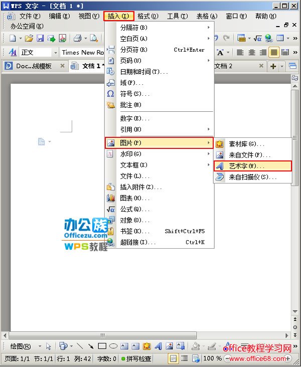 1 打开我们的WPS文字文档,点击“插入”选项卡,在弹出的下拉菜单中选择“图片”选项中的“艺术字”命令;