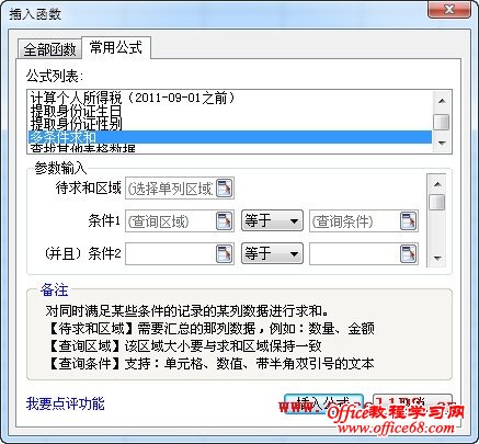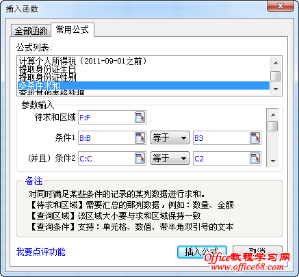 在MS Excel中进行多条件求和需要手工输入公式,对于初学者来说可能有些不便。而在WPS 表格中提供了一个“插入公式”的功能,可以直接在单元格中插入常用公式,十分方便。多条件求和公式就是WPS 表格提供的常用公式之一,初学者无需掌握复杂的函数或公式就可以方便地在表格中进行多条件求和。例如下表为某公司的一些商品销量,需要在单元格中得到“城市”为“武汉”,“类别”为“男”,“商品名称”为“袜子”的“销售数量”。 在WPS 表格中步骤如下: 1.打开“插入函数”对话框。 选择需要放置结果的空单元格,依次单击“公式→插入函数”,弹出“插入函数”对话框,选择“常用公式”选项卡。 可以看到其中已列出了一些常用的公式,如“计算个人所得税”、“提取身份证生日”等,拖动滚动条找到并选择“多条件求和”。 2.输入参数。 在“参数输入”区域中设置多条件求和的参数。本例中的设置为: “待求和区域”为 F列; “条件1”为 B列 “等于” B3 “条件2”为 C列 “等于” C2 如下图所示,如果有更多的条件可继续输入参数。 单击“插入公式”按钮,WPS 表格即可自动在单元格中插入下面的公式并返回结果,是不是很方便啊。 =SUMPRODUCT(F:F,1*(OFFSET(F:F,0,SUM(COLUMN(B:B)-COLUMN(F:F)))=B3)*(OFFSET(F:F,0,SUM(COLUMN(C:C)-COLUMN(F:F)))=C2)) 这个功能对于不熟悉函数或公式的初学者非常方便,但同时也可以看到,该功能如果能进一步提升就更好了。例如添加下面的功能: 1.在功能区中添加“插入公式”的命令,以便快速打开“插入公式”对话框。同时对于已包含公式的单元格也能使用该命令。 2.在功能区或右键菜单中提供“修改公式”的命令。 3. 增加在“常用公式”选项卡中添加自定义公式的功能。 4.“多条件求和”公式在设置参数时,各个条件之间除了“并且”(与)的关系外,还可以设置“或者”(或)的关系。 |
