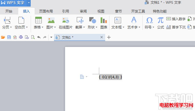 2、在“{  }”中键入“EQ F(4,3)”(这里以打出四分之三为例)