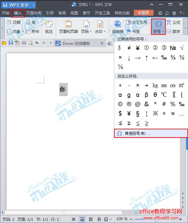 2 选中输入的汉字,切换到“插入”选项卡,点击“符号-其他符号”,如下图。