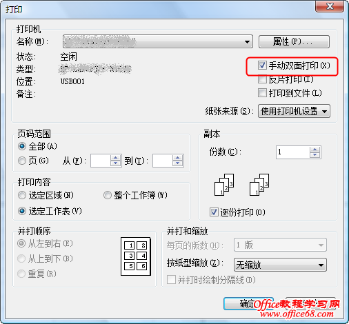 在“打印”对话框中,勾选“手动双面打印”选项,单击“确定”。