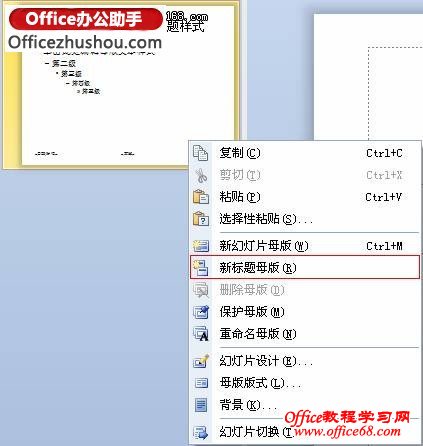 Step2:右侧显示出当前的母版样式,要更改只需要选中这张幻灯片母版,右键选择“新标题母版”。